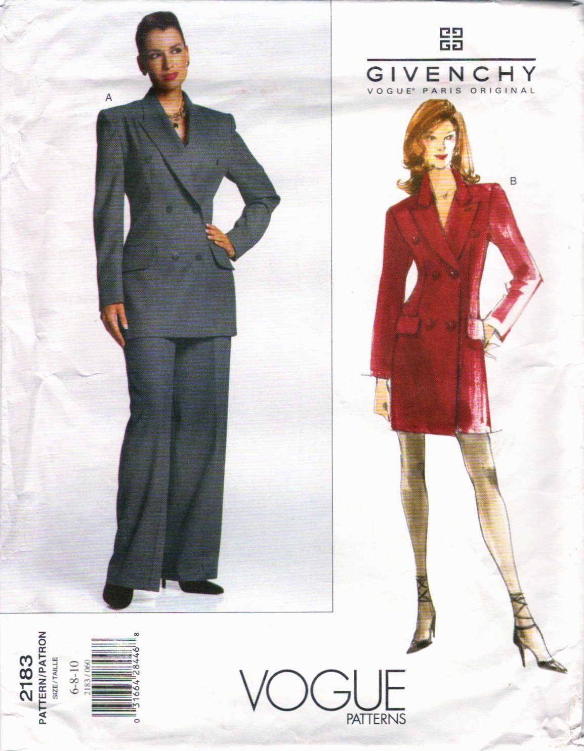 Here’s the pattern envelope description: Misses’/Misses’ Petite Jacket, Dress & Pants: Loose fitting, partially interfaced, lined, double breasted, below hip jacket or straight dress, above mid-knee, has collar, slightly extended shoulders, shoulder pads, side panels, no side seams, flaps, welt pockets and long, two-piece sleeves. Semi-fitted, lined, straight-legged, floor length pants have waistband, side front pockets and fly zipper closing. Featured in the November/December 1998 issue of Vogue Patterns (Shop Vogue).