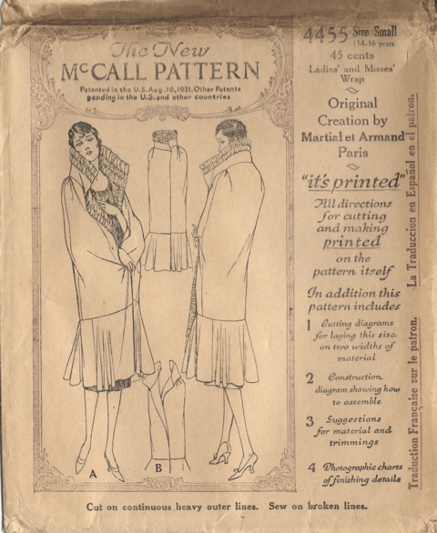 For my vampire flapper Halloween costume, to wear over my 1926 Chanel evening dress I made McCall 4455, an evening wrap by Martial et Armand: