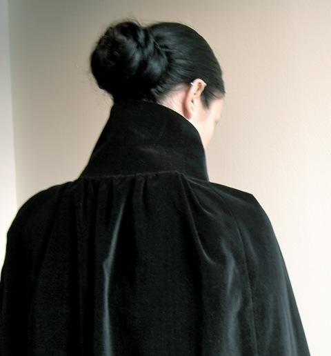 One difficulty I encountered was with the ease at centre back. Dazed from too much diagonal basting, I forgot how to ease with double rows of stitches and used only a single row, so that there were gathers at the back. I didn’t remember until after I’d hand-stitched through the collar seam. I redid the entire area, only to find I had produced… nicer gathers. I did pre-steam the velveteen, so I’m not sure whether it could have been shrunk further. I wish I’d been able to get it right, but there it is.