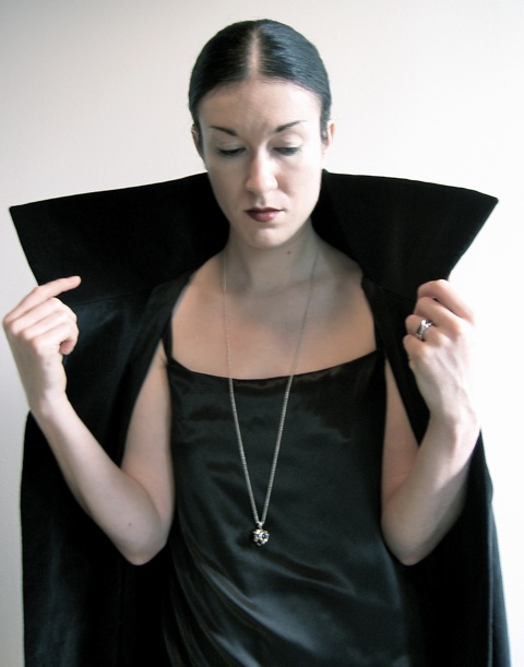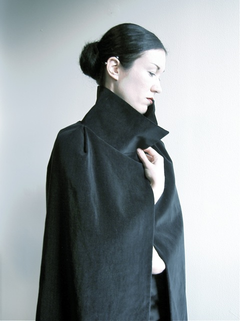 Here are some photos of the finished wrap. Despite having seen the illustration, I wasn’t prepared for the drama of the standing collar: