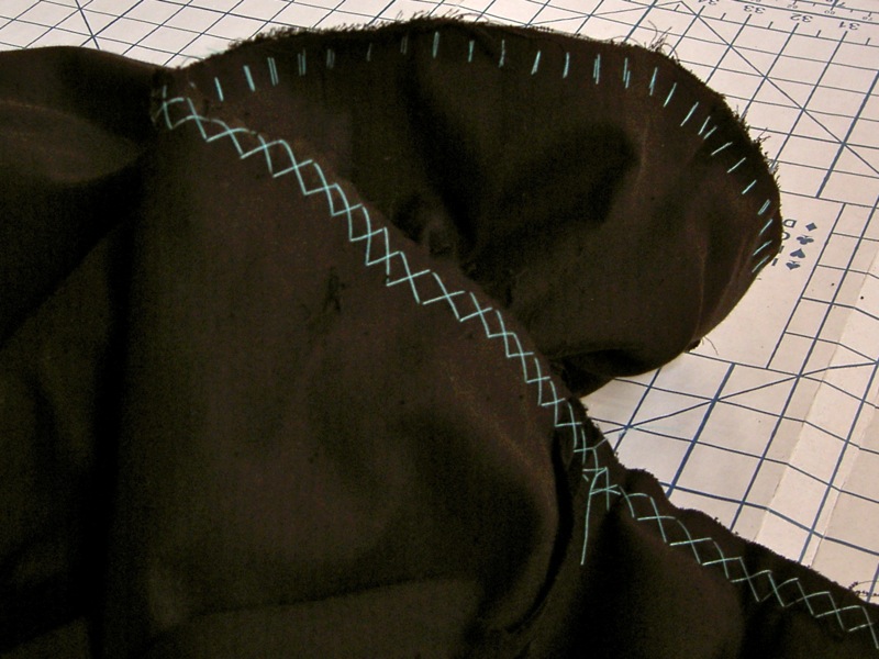 To ensure the velveteen didn’t slip, I used a diagonal basting technique I found in Claire Shaeffer’s Couture Sewing Techniques which is known as ‘cross stitching.’ (See her diagrams on Google books here and here.) This technique involves hand-basting over the seamline with diagonal stitches, then basting again in the opposite direction so that you have a series of ‘X’s across the seamline. Here’s a photo of the diagonally basted flounce: