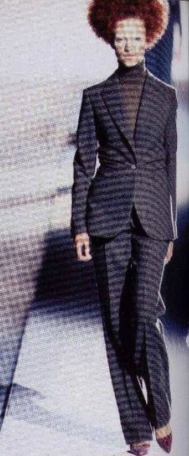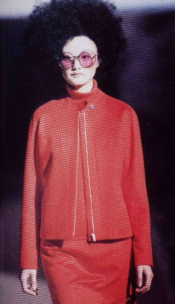The Guy Laroche Fall 1998 ready-to-wear collection showed off Elbaz’s skillful tailoring with pinstripe and monochrome looks, as well as entire outfits of red sequins and long dresses in jersey and velvet. In counterpoint to the commercially viable clothes, the models were made up to mask their eyebrows, and almost all wore Afro wigs. (See Anne-Marie Schiro’s review here.)
