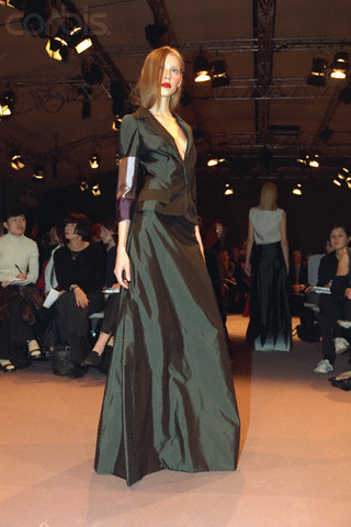 Elbaz was leaving to design Yves Saint Laurent Rive Gauche, and his last collection for Guy Laroche was a sad farewell. To a soundtrack of Edgar Allan Poe’s “Annabel Lee,” the models walked the runway in floor-grazing skirts, dressed in sombre colours accented with contrast inserts or embellished with drooping flowers. (See Suzy Menkes, “Designers Struggling to Find a Voice,” and Anne-Marie Schiro, “Anticipating the Mood: Retailers Check the Pulse.”)