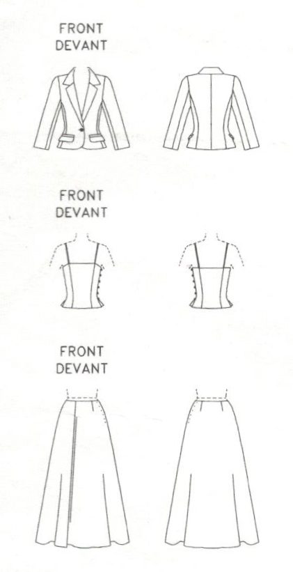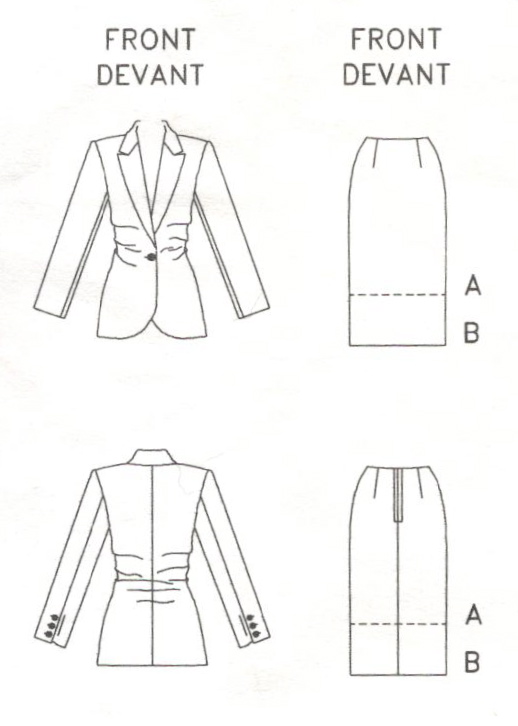 Here’s the envelope description: Misses’ jacket & skirt. Close-fitting, bias, interfaced, lined, below hip jacket has collar, slightly extended shoulders, shoulder pads, ruching, no side seams and long, two-piece sleeves with vent and button/buttonhole trim. Straight, lined skirt, above mid-knee or mid-calf, has contour waist and back zipper. Purchased top.