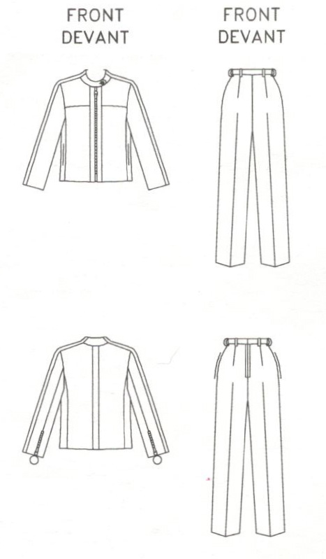 Here’s the envelope description: Misses’ jacket & pants. Semi-fitted, lined, above hip jacket has neck bands, front yokes, inset bands, side panels, no side seams, side front pockets, exposed front/sleeve zippers and long, two-piece sleeves. Straight-legged pants have waistband, carriers, side pockets and back zipper. Purchased top and belt.