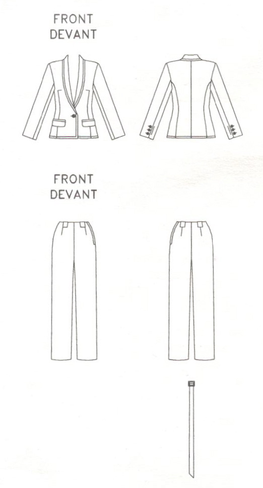 The envelope description reads: Misses’ jacket, pants & belt. Fitted, unlined, hip length jacket has front extending into collar (wrong side shows) and to side back, no side seams, shoulder pads, flaps, pockets and lined, long, two-piece sleeves with button vent. Fitted, straight-legged pants have contour waist, carriers, belt and side zipper. Purchased top.