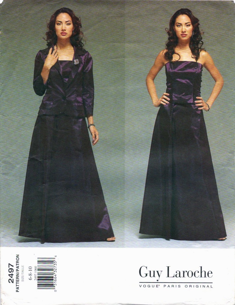 Vogue Patterns’ selection from this collection, Vogue 2497, is a modern evening suit with tailored jacket, long skirt, and side-buttoned camisole top: