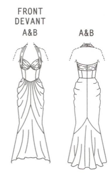 The envelope description reads: Misses’ Dress: Close-fitting, halter dress with lined gathered draped bodice and topstitched trim princess seam midriff, gathered skirt forming drape around hipline. Hooks and eyes, invisible zipper closing and floor length. View A has a contrast midriff.