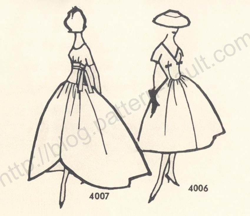 “Givenchy’s young-in-heart evening gown for any age, the belling skirt curved in a prophetic cut-away hemline. Givenchy chose a paper-crisp taffeta, but you could also use polished cotton, silk or satin. The pattern includes a beautifully shaped petticoat.” (4007) “Two flightly [sic] little bow-knots hint at a high waistline on this afternoon frock with bell-shaped skirt buoyed by its own print-bordered petticoat. Givenchy selected a printed tissue-weight taffeta, also suggests silk surah or peau de soie.” (4006)