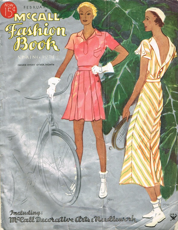 In the early 1930s, sports dresses had lower hemlines, but could be worn unbuttoned in the back, like this McCall’s sports dress from 1933: