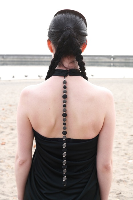 Instead of using the 18-inch tassel the pattern calls for, I strung together some mesh beads from Arton Beads on Queen Street West. With stainless steel spacer beads the strand is fairly heavy, but I like the effect when it’s fastened to the back extension.