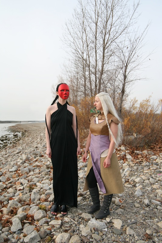 In the books Quaithe is hardly described at all apart from her red lacquered mask, so I had a lot of freedom. Asshai, in the fantasy world’s mysterious east, is known for its worship of R’hllor, a fire religion with Zoroastrian echoes. After doing some research into ancient Persian costume, which showed periodic Greek influences, I opted to use my Very Easy late ’70s Givenchy evening dress pattern, Vogue 2014: