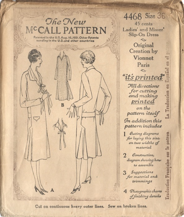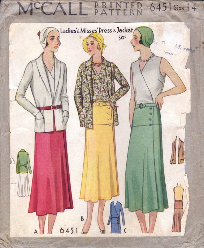 McCall’s magazine showed two illustrations for this design (McCall 6451); the text on the first page reads, “A masterpiece in simplicity that only Vionnet could have created. The chic contrasting bodice top is sleeveless and joins the skirt in a coat-dress closing”:
