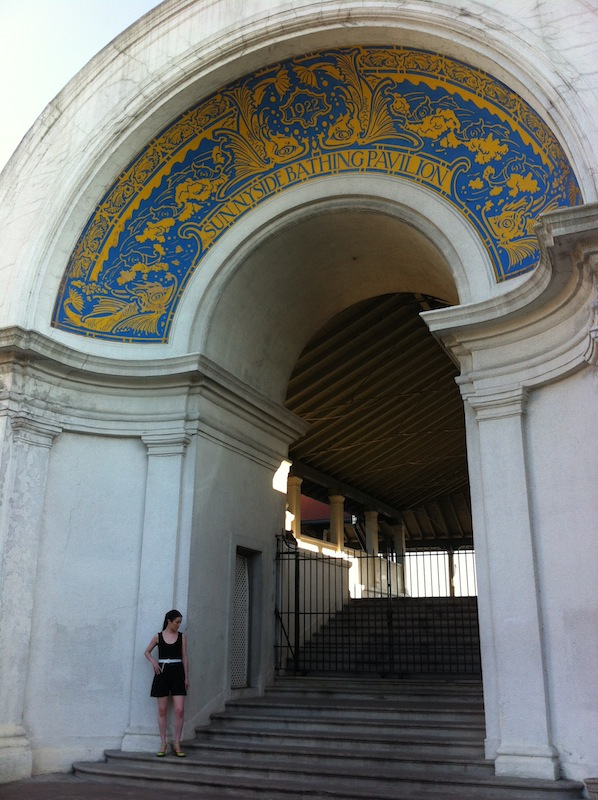 Naomi and I took some photos of the swimsuit at the old Sunnyside Bathing Pavilion. This archival photo shows the pavilion in its heyday: