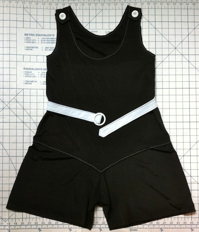 I made the one-piece with scoop back. I found some lightly textured, black swimwear fabric on sale at King Textiles’ old location, with matching white fabric for a contrast belt. To face the upper bodice and belt I used tricot interfacing/lining from Designer Fabrics, where I also got some plain 1″ buttons. The 1.5″ belt buckle is from Leather & Sewing Supply Depot (now at 204 Spadina).