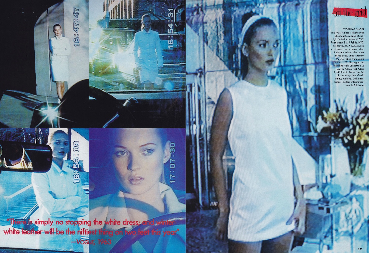 Launching the series is “Courrèges Edge,” a 1995 editorial photographed by Nick Knight and showing Kate Moss in clothes made using patterns from Vogue and Butterick. The shoot covers the Sixties trend with all-white, Courrèges-style looks while playing with the theme of surveillance.