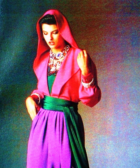Here Evangelista shows off advanced-class colour blocking in Vogue 1721, a Nina Ricci pattern for a dramatic hooded blouse, mock-wrap skirt, sleeveless top, and sash: