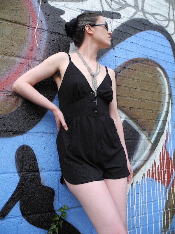 I used a black glitter stretch knit from my stash, found at Fabricland’s old downtown location. The pattern needed extensive resizing. Due to the mid-1970s unofficial sizing change (thanks to Peter for drawing my attention to this) the 10 was fine on top. (That’s my copy on the wiki.) I added some ease to the midriff band and adjusted the bodice and shorts to match up to it. I also lengthened the rise, added to the crotch length, and slashed to add some room in the hips. Yes, it’s a stretch knit, but I was trying to be faithful to the ease of the original.