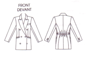 The envelope description reads: Misses’ Jacket. Loose-fitting, lined, below hip, double-breasted jacket has notched collar, shoulder pads, welt and buttonhole pockets, side back seams, elasticized, side back-button tab and long, two-piece sleeves with button vent. Purchased top.