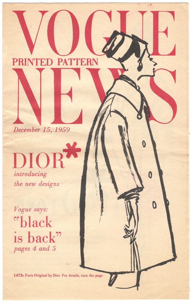 In the next issue of Vogue Pattern Book, the Vogue 1472 coat is called “the newsmaking original Dior coat that tops the suit… Note the extras here: the enormous buttons, the slashed side seams, the stitched collar, the scarf to match. Your own extra: a towering cloche of the checked fabric”: