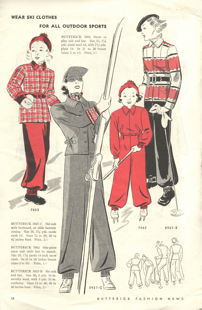 Postwar skiwear retained the slimmer silhouette that had been prompted by wartime fabric rationing. From 1946, Butterick 3985 is a ski suit with jaunty cropped jacket and detachable hood: