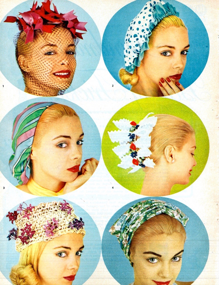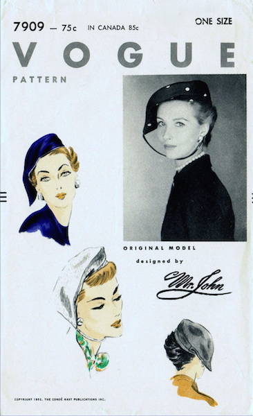 Vogue 7909 was still available the following year, as seen in this 1953 illustration for Ladies’ Home Journal. The lower two hats are by Mr. John: