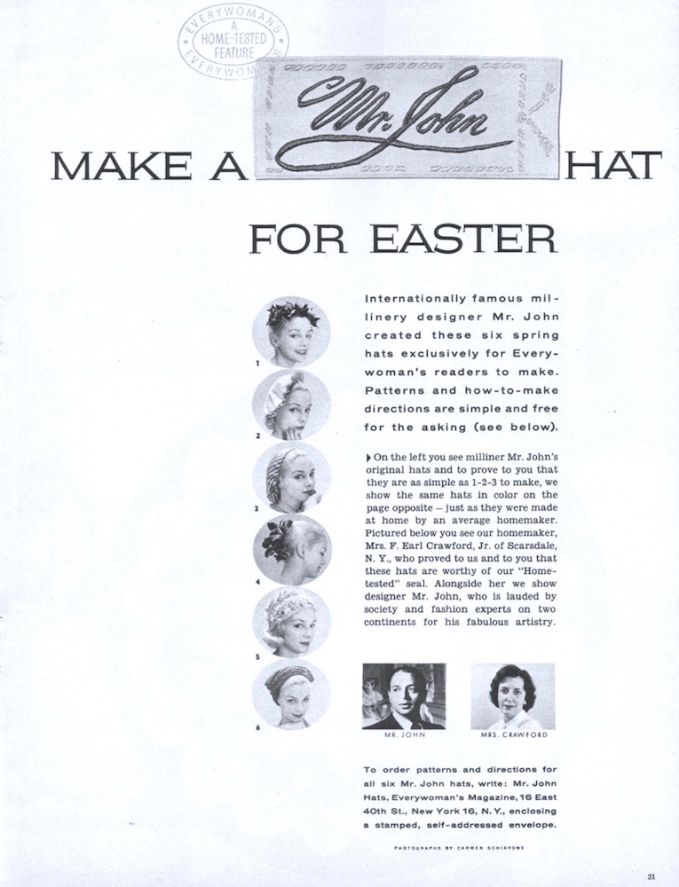 In the later 1950s, Mr. John designed six spring hats for Everywoman’s magazine. Carmen (Carmine) Schiavone photographed one of them for the cover of the Easter issue: