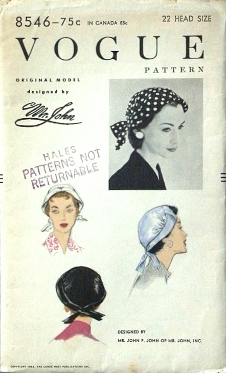 Millinery patterns by Mr. John were available from Vogue in the first half of the 1950s. There were also mail-order Mr. John patterns from Spadea and Prominent Designer, as well as garment patterns from Advance. Vogue’s later John-Frederics patterns date to the tenure of Mr. John’s former partner, Frederick Hirst.