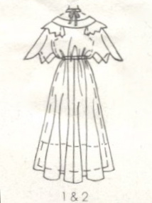 Here’s the envelope description: Misses’ Lined Wedding Dress or Evening Dress in Two Lengths — Dress has shoulder yoke with serrated frill and pointed cape effect on bodice. Skirt has elasticated waistline. Model 1 bead trim is used on yoke and neck tie. Suggested fabrics: Lightweight silk types, crepe de chine, chiffon, shantung, lace, voile, batiste, organza. Lining: Jap silk, crepe de chine. Trim: wide ribbon and pearl beading or narrow ribbon.