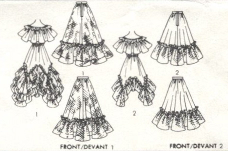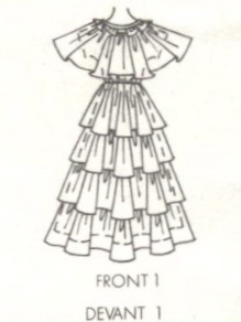 Here’s the envelope description: Misses’ Dress in Two Lengths — Dress has fitted bodice with elasticated waistline. Models 1 and 3 have bodice frill to waistline. Model 2 has shorter bodice frill. Models 1 and 2 have four-tiered skirt flounce. Model 3 has three-tiered skirt flounce. Suggested fabrics: Chiffon, georgette, voile, silk or synthetic sheers, organza. Also: lightweight lining fabric. Trim: wide ribbon; pearl trim (views 1 and 2).