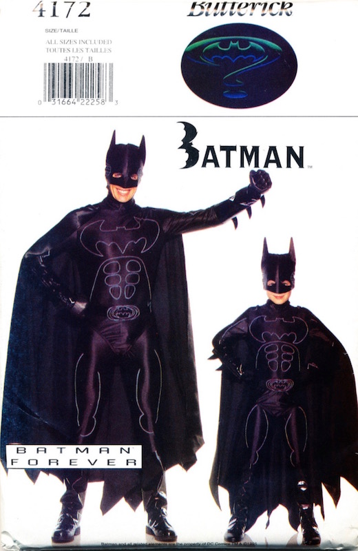 Butterick licensed costumes from Batman Returns (1992) and Batman Forever (1995): Batman, Catwoman, and the Penguin, and Batman, Robin, and the Riddler. The Batman costumes reflect the movies’ increasingly hypermasculine armour, while Catwoman’s sexy, home-sewn catsuit is the only design for women and girls.
