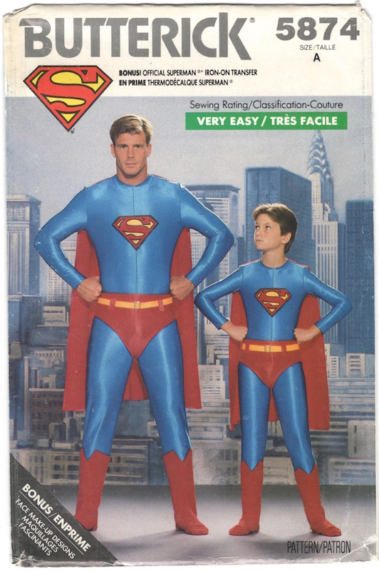 In 1987, Butterick released two superhero patterns, both with iron-on transfers: a Superman and Supergirl play suit for small children (sizes 2 to 6X), and a Superman costume for men and boys. I couldn’t find a corresponding women’s and girls’ Supergirl pattern. The small children’s is a pyjama or jogging suit-style top and pants for stretch knits, with separate cape and skirt; the men’s and boys’ is a spandex stirrup jumpsuit and briefs:
