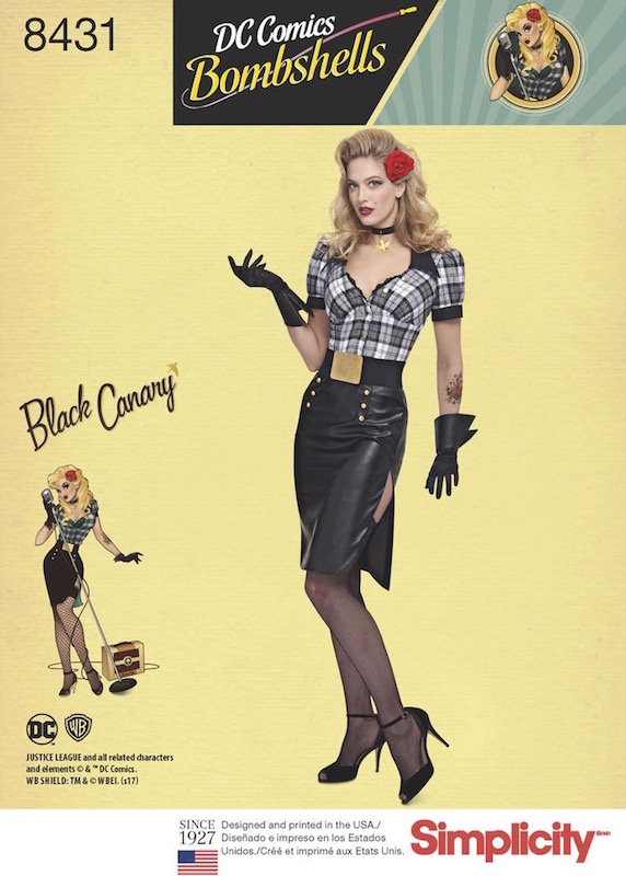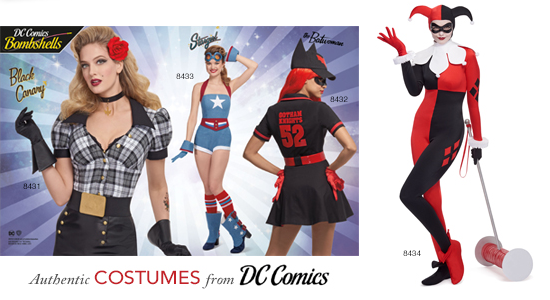 Update, summer 2017: Simplicity’s Early Fall catalogue added more DC patterns: Harley Quinn and DC Bombshells Black Canary, Stargirl, and Batwoman.