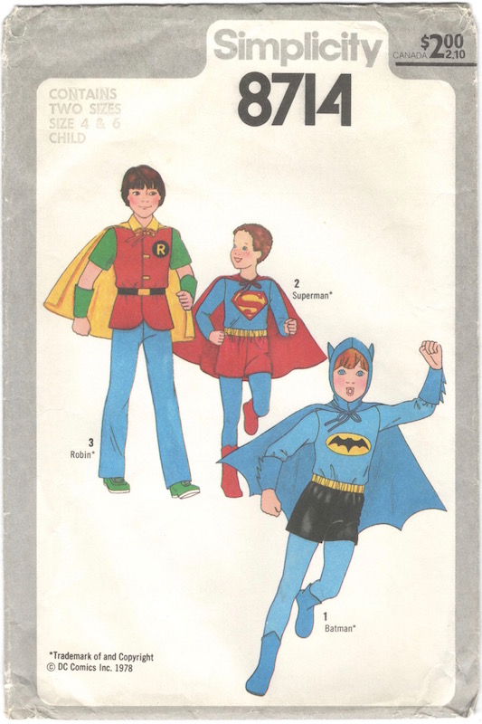 From 1966, McCall’s 8398 is a pattern for “Girls’ or Boy’s Batman, Robin and Superman Official Costumes.” The pattern is copyright National Periodical Publications, Inc., an early version of DC Comics: