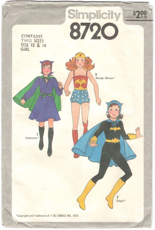 That year, Simplicity released two patterns for children’s superhero costumes: Simplicity 8714, Batman, Robin, and Superman costumes for children and boys, and Simplicity 8720, Catwoman, Batgirl, and Wonder Woman costumes for girls. (‘Child’ often refers to unisex pattern sizing for younger children.) The introduction of female superhero costumes seems to have prompted a sex-division on the pattern envelopes—although the categories could always be subverted by individual children and their parents: