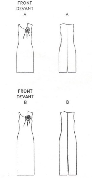 Here’s the envelope description: Semi-fitted, straight, lined, sleeveless dress, below mid-knee or evening length, has neckline tucks, side zipper and back hemline slit. Purchased flower. Recommended fabrics are silk-like crepe, lightweight wool crepe, and satin-backed crepe.