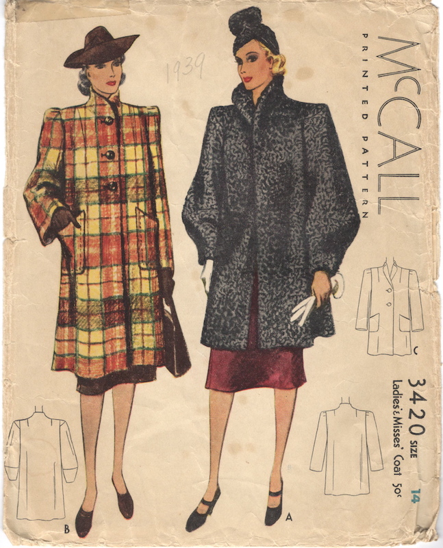 From the autumn of 1939, McCall 3420 is a swagger coat with built-up neckline and optional, tapered lower sleeves and semi-circular shoulder insets. View A is shown in faux Astrakhan (matching hat unfortunately not included):