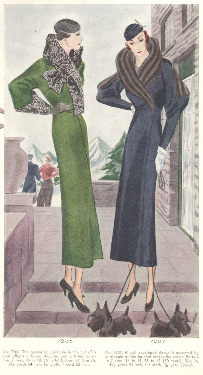 Thirties patterns show many creative uses of fur trim. These two ca. 1933 coats both call for fur cloth accents. McCall 7206 has an attached scarf and contrast lower sleeves, shown in synthetic Persian lamb, while McCall 7207 has a deep fur collar and matching, triangular sleeve patches: