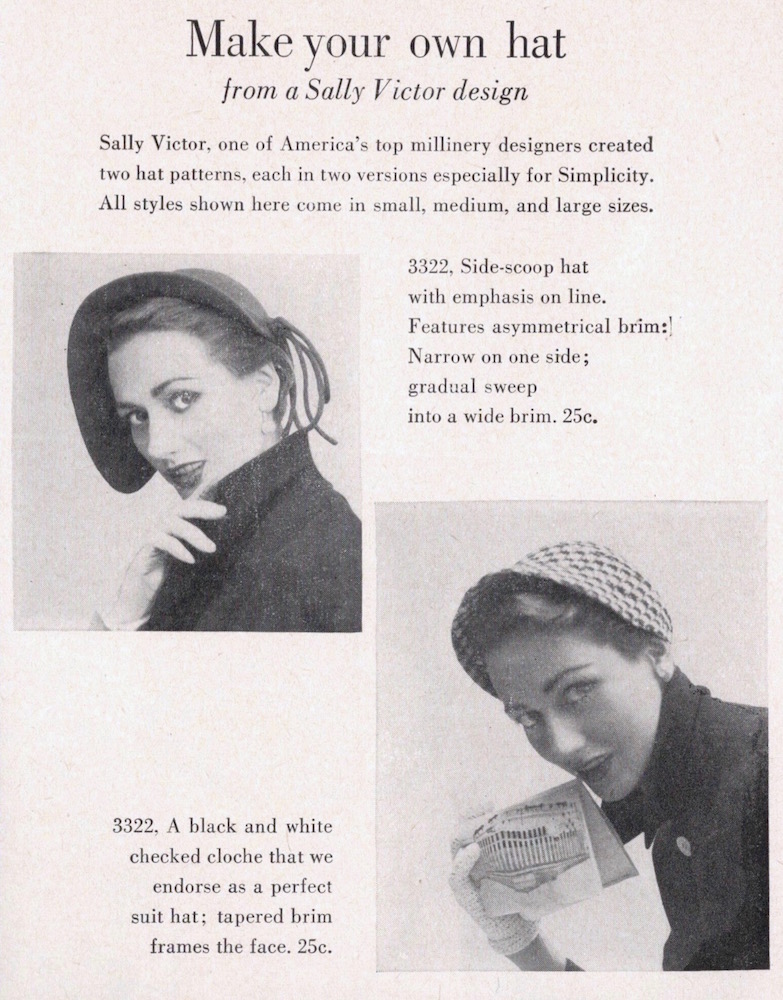 The suit is Simplicity 3310, made in Botany flannels and worn with “[m]atching hat designed for Simplicity by Sally Victor,” Simplicity 3322.