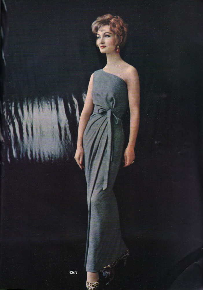 Tripp may also be seen in early 1960s Vogue Pattern Book editorials. Here she wears Vogue 4267, a one-shouldered dress in wool jersey: