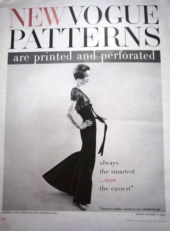 Tripp also appeared in a 1956 Vogue Patterns advertisement promoting the new printed and perforated patterns. The evening dress pattern is Vogue S-4735: