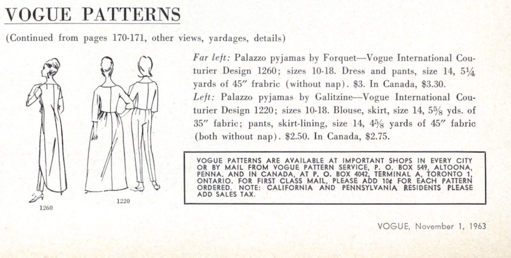 Whether you’re going out or staying in, palazzo pyjamas are perfect for New Year’s Eve. “Pyjama Game—the palazzo persuasion,” a 1963 Vogue editorial photographed by Gene Laurents, features two Vogue Couturier patterns for evening pyjama ensembles.