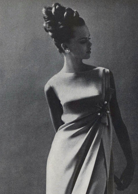 Both patterns are by designers based in Rome: Federico Forquet and Irene Galitzine. Vogue 1260 by Forquet is a sleeveless, draped evening dress that’s slit to reveal slim, matching pants. The original was apricot silk crêpe (click to enlarge):