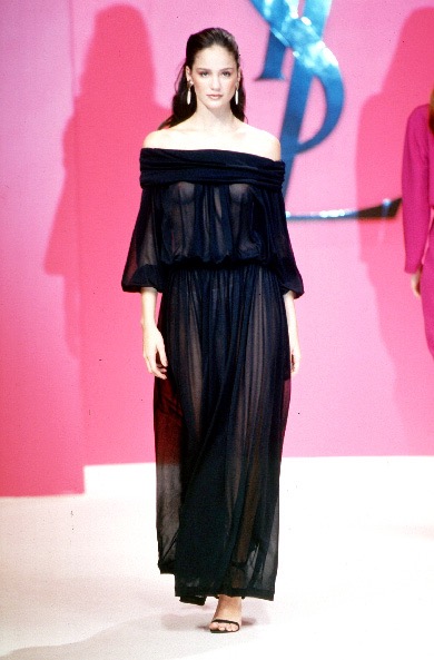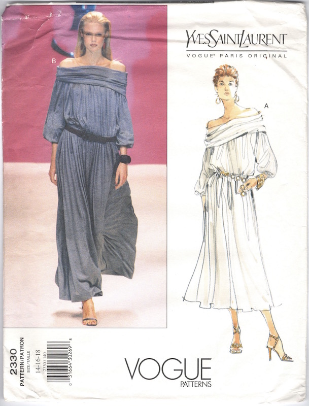 Another element in the romantic/gothic repertoire is tzigane or ‘gypsy’ looks. From Yves Saint Laurent Rive Gauche for Spring 1999, Vogue 2330 is a long, flowing, off-the-shoulder dress. The envelope shows a mourning-appropriate mauve, but it was also shown in sheer black: