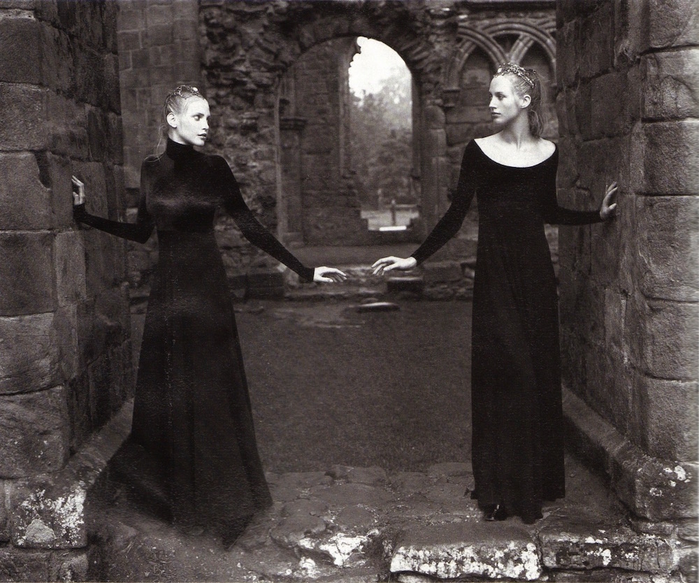 Similar Donna Karan dresses opened a British Vogue editorial shot by Mario Testino at Bolton Abbey, Derbyshire (headpieces by Slim Barrett):