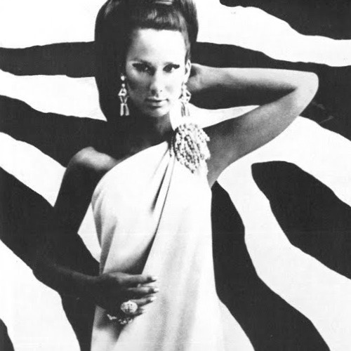 A Gordon Parks editorial for British Vogue features Brigitte Bauer in NYE-worthy evening patterns.