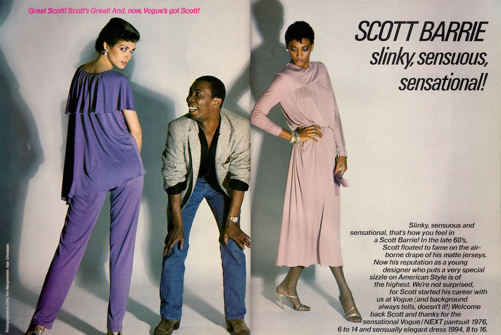 Scott Barrie (1946-1993) began his career at Vogue Patterns, so his introduction to home sewers was also a welcome back. Chris von Wangenheim photographed Barrie with two models for a feature highlighting his work with matte jersey. The patterns are Vogue 1976 (on Gia Carangi) and Vogue 1994: