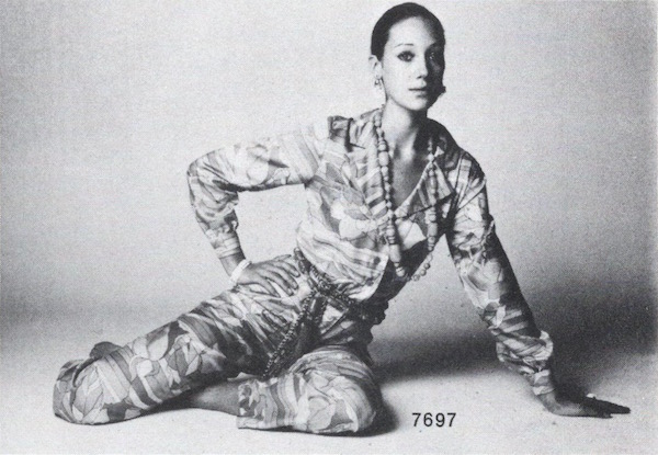 The issue of Vogue Pattern Book with the Berenson cover (shown above) includes more of her editorial work. In “New Evening Splendour,” she wears the cover look, caftan Vogue 7827, as well as Vogue 7834 and Vogue 7836: