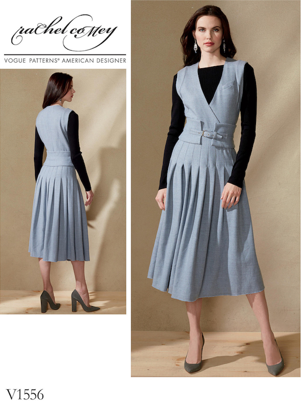 V1556 is a raw-hemmed, sleeveless dress shown worn as a jumper. With sleeves it becomes the Cumberland dress.