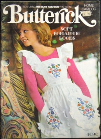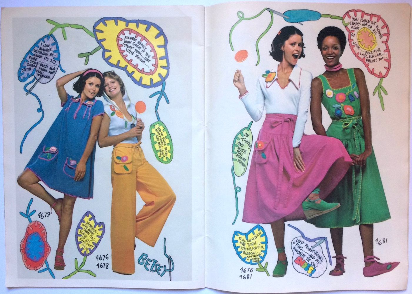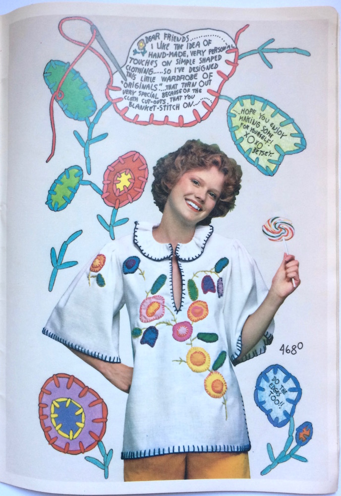 One of the first items I sold on Etsy was this 1975 issue of Butterick Fashion News with a Betsey Johnson cover. (Click to see inside.) The same embroidered pinafore was featured on the home catalogue cover: